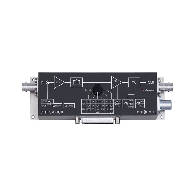 DHPCA-100 的許多特性包括:從 10 2到 10 8 V/A 的可調(diào)增益、可調(diào)偏置和偏移電壓、可切換的 10 MHz 和 1 MHz 低通濾波器、可切換的 AC/DC 耦合以及所有重要的選項可以直接在設(shè)備上或通過數(shù)字接口(例如使用 PC)控制功能。所有這些都安裝在堅固、緊湊且符合 EMC 標(biāo)準(zhǔn)的外殼中,允許直接在信號源進(jìn)行放大,而無需長電纜或干擾信號。