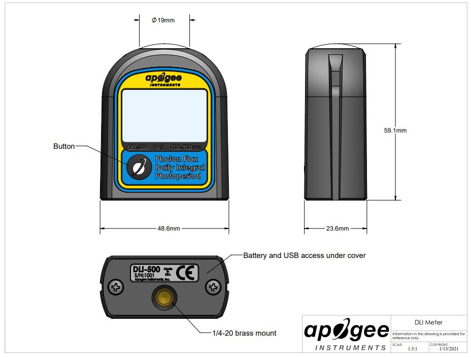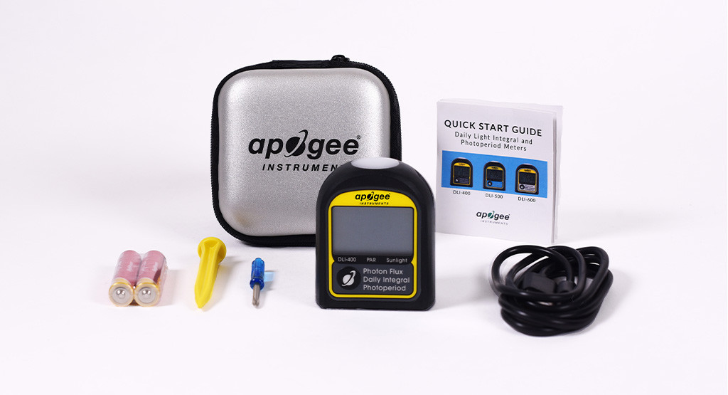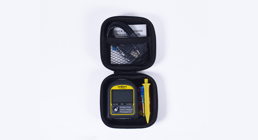 堅(jiān)固耐用且隨時(shí)可用:DLI-400 堅(jiān)固耐用,防護(hù) 等級(jí)為 IP65,可承受惡劣和潮濕的環(huán)境,可以隨身攜帶進(jìn)行抽查,直接放置在任何水平表面上,或通過連接到常用的相機(jī)三腳架、夾具或使用底部的標(biāo)準(zhǔn) ?-20 螺紋端口進(jìn)行樁子。DLI 儀表由鑄造丙烯酸擴(kuò)散器(過濾器)、光學(xué)過濾器、光電二極管、信號(hào)處理電路和安裝在 ASA 塑料外殼中的 LCD 顯示屏組成。每個(gè) DLI 包裝都包括儀表、一個(gè)保護(hù)性手提箱、兩節(jié) AAA 電池、一個(gè)快速入門說明指南、一把螺絲刀、一個(gè)便于安裝的土壤釘和一根 USB-C 電纜,用于將儀表存儲(chǔ)的數(shù)據(jù)作為 CSV 文件下載到計(jì)算機(jī)。