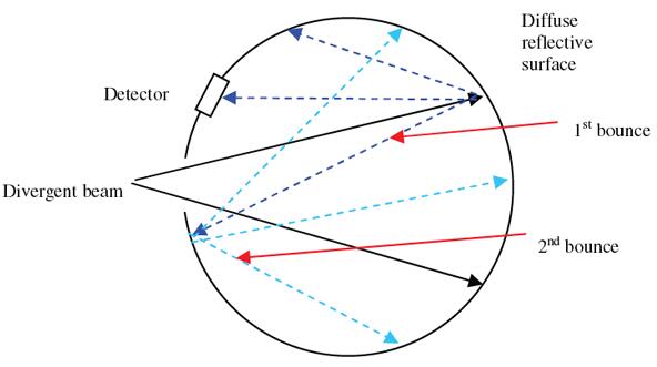 積分球用于測量發(fā)散光源。如圖所示,積分球的內(nèi)表面涂有以散射、非鏡面方式高度反射(通常為 99%)的表面。因此,當(dāng)發(fā)散光束射到積分球壁上時(shí),光線會(huì)被反射和散射多次,直到射到球壁上任何地方的光都具有相同的強(qiáng)度。因此,放置在球體中的檢測器獲得與其他任何地方相同的強(qiáng)度,并且檢測器檢測到的功率與與光束發(fā)散無關(guān)的總?cè)肷涔β食烧?。(檢測器的布置使其只能看到散射光,而看不到入射光束。)理想的積分球具有具有朗伯反射特性的表面。這意味著入射到表面上的光在表面上方 2pi 球面度立體角的所有方向上均勻散射。Ophir 積分球頭中使用的表面非常接近朗伯表面。