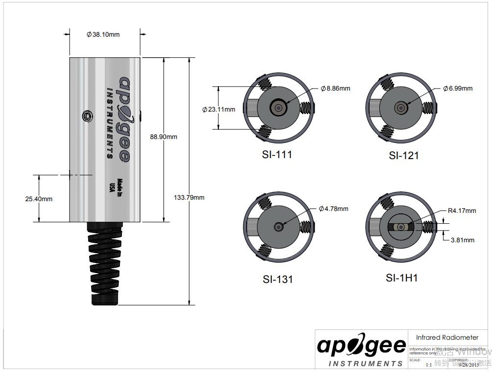 SI-411具有SDI-12數(shù)字輸出和高質(zhì)量電纜,端接在預(yù)鍍錫尾纖引線中,便于連接到數(shù)據(jù)記錄器和控制器。該傳感器具有22°半角度視場,響應(yīng)時間為0.1秒。為了更好地安裝,已經(jīng)更新了遮陽板設(shè)計(有關(guān)更多信息,請參閱產(chǎn)品圖片)。典型的應(yīng)用包括用于植物水分狀況估計的植物冠層溫度測量、用于確定結(jié)冰條件的路面溫度測量以及用于能量平衡研究的地表(土壤、植被、水、雪)溫度測量。傳感器包括IP68 不銹鋼電纜連接器,距離頭部30厘米,以簡化傳感器的拆卸和更換,便于維護和重新校準。SI-411-SS設(shè)計用于安裝遠地點AM-250商用安裝支架。