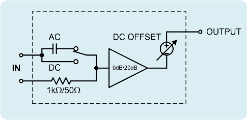 圖1顯示了TS250波形放大器的功能等效圖。它由交流耦合或直流耦合輸入、可選輸入阻抗(高阻抗或 50Ω)、可選增益級(0dB 或 20dB)、高電流放大器和直流輸出偏移組成。可調(diào)節(jié)的直流偏置設(shè)置輸出直流電壓。此直流偏移功能非常適合 LDO 或放大器 PSRR 測量,因?yàn)樗鼈冃枰绷麟妷骸?