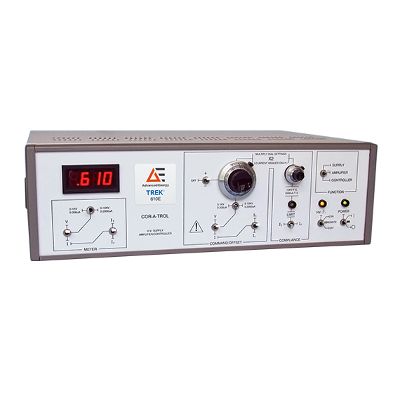 Trek 610E 提供六種高壓操作模式。作為高壓放大器,Trek 610E 通過(guò) 100 V/V 或 1000 V/V 的開(kāi)關(guān)可選設(shè)置放大外部施加的信號(hào)。當(dāng)用作跨導(dǎo)放大器時(shí),外部施加的電壓信號(hào)產(chǎn)生成比例的輸出電流。作為高壓參考電源,Trek 610E 的前面板旋鈕控制輸出電壓,當(dāng)用作電流電源時(shí),同一個(gè)旋鈕控制輸出電流??刂破髂J较碌?Trek 610E 保持高壓放大器模式,但放大器輸入和反饋元件未固定,可供用戶配置。