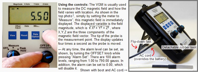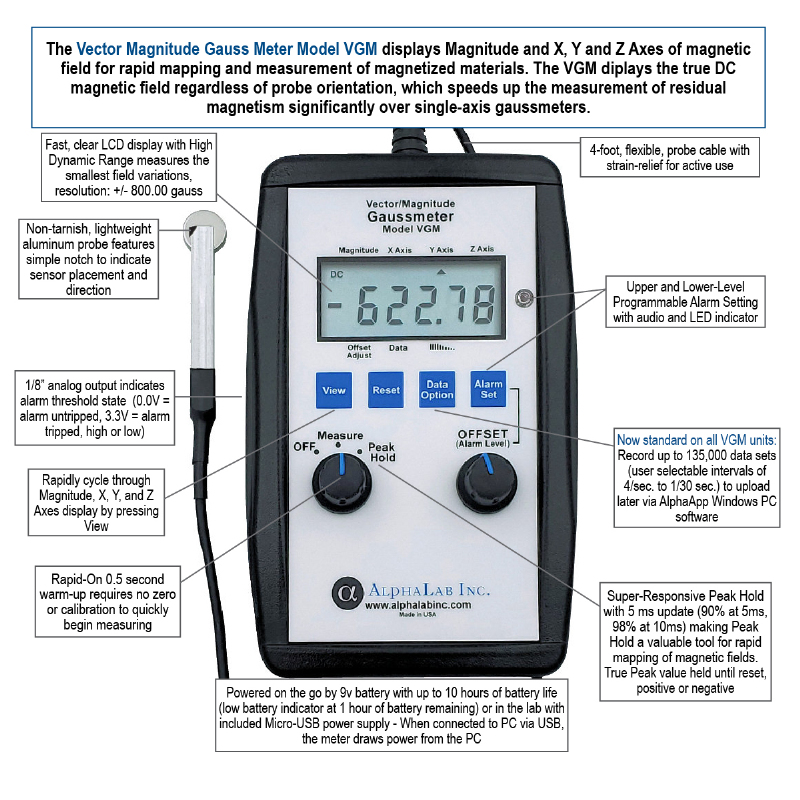 VGM 型號專為快速識別和測量磁化區(qū)域而設(shè)計。它是一個直流高斯計,在探頭末端帶有 X、Y 和 Z 傳感器。它顯示場的大小以及 X、Y 和 Z 分量,同時顯示所有變量的實際值和峰值。此外,只要場強大于您設(shè)置的值,警報就會響起并亮起,并且“邏輯高”信號會出現(xiàn)在輸出插孔。該儀表出廠時即可使用,包括一個 9 伏電池、USB 電源適配器和校準(zhǔn)證書。該儀表經(jīng)過優(yōu)化,可測量磁化零件;它的 799.99 高斯范圍不足以測量大多數(shù)永磁體的表面。