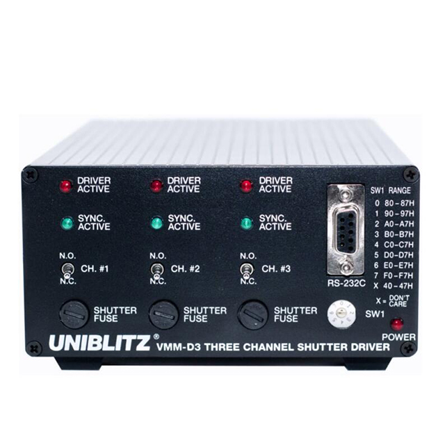 Uniblitz VMM-D3 是一款三通道快門驅(qū)動(dòng)器,能夠獨(dú)立控制最多三個(gè)快門。這種緊湊的設(shè)計(jì)將三個(gè)完整的獨(dú)立快門驅(qū)動(dòng)器放在一個(gè)精簡(jiǎn)的封裝中。有源高電平邏輯輸入允許完全獨(dú)立的快門控制。單個(gè)輸入將同時(shí)激活所有通道,并且單個(gè)輸出可用于監(jiān)控所有快門同步系統(tǒng)電路何時(shí)處于活動(dòng)狀態(tài)。三個(gè)有源低電平邏輯輸出監(jiān)控每個(gè)同步系統(tǒng)輸出的狀態(tài)。還提供可尋址的 RS232-C 串行輸入,可通過計(jì)算機(jī)串行端口控制這些輸入,從而允許從單個(gè)計(jì)算機(jī)串行端口控制最多八個(gè) VMM-D3 單元和最多 24 個(gè)獨(dú)立快門。