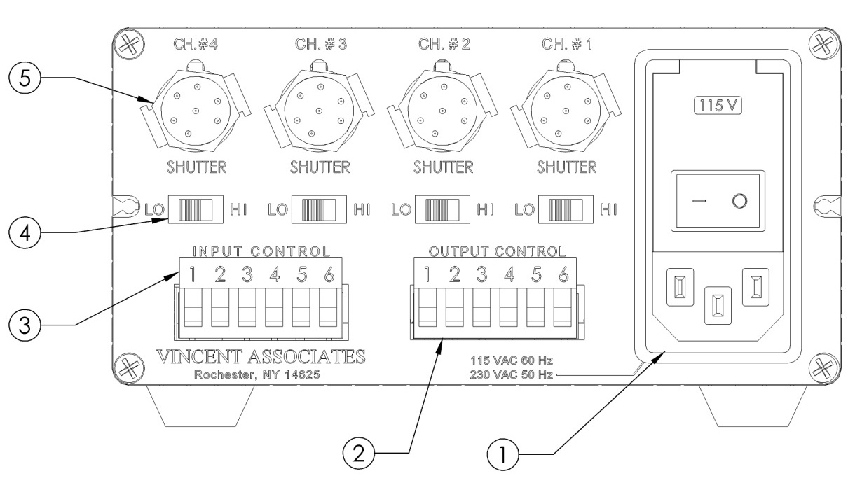 | 輸入控制 (3) | 為每個(gè)通道提供高電平有效控制。輸入 TTL 高電平 – 快門打開,輸入 TTL 低電平 – 快門關(guān)閉。端子 #5 – 高電平有效,輸入 TTL 高電平 – 所有快門打開,輸入 TTL 低電平 – 所有快門關(guān)閉。請(qǐng)參閱 VMM-D3/D4 用戶手冊(cè)第 15-19 頁中的端子排布局。 |