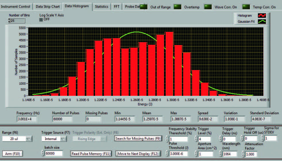 想查看脈沖能量數(shù)據(jù)組的統(tǒng)計分布嗎?直方圖界面可以幫您實現(xiàn)。直方圖將為數(shù)據(jù)擬合“高斯曲線”。直方圖會沿圖表底部顯示完整的統(tǒng)計計算連同脈沖頻率。在統(tǒng)計數(shù)據(jù)的下方,您可以看到量程和觸發(fā)等儀表控制鈕。您還可以根據(jù)需要調(diào)整觸發(fā)延遲和釋抑。