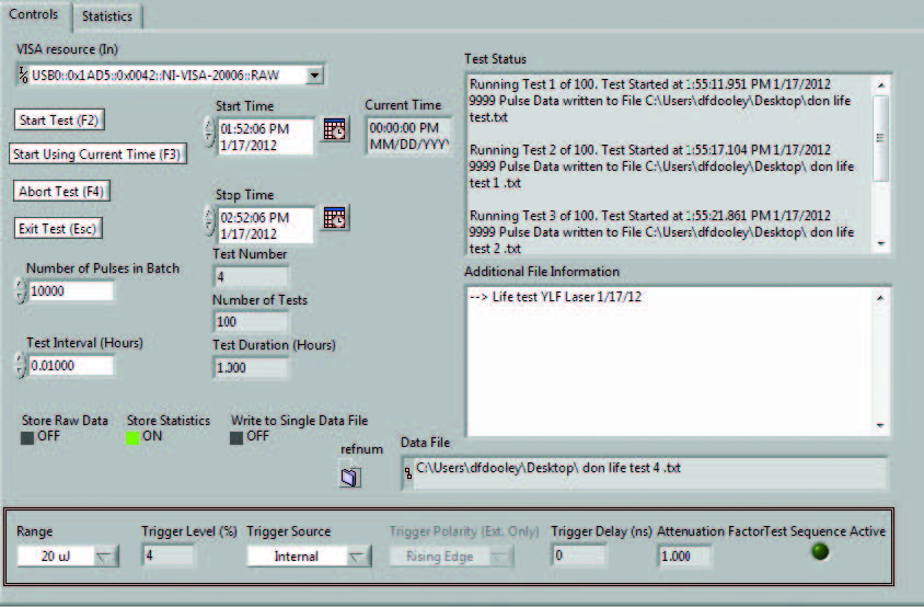 您是否希望對高重復(fù)頻率脈沖激光器開展壽命測試?是否想了解環(huán)境變化(例如溫度)對循環(huán)測試產(chǎn)生的影響?我們新增了一項強大功能,可助力您實現(xiàn)上述需求。在壽命測試界面中,您可自主選擇所需的統(tǒng)計指標(biāo),設(shè)定測試的起始日期與時間、結(jié)束日期與時間、脈沖數(shù)量以及測試間隔。您僅需指定一個用于存儲數(shù)據(jù)的文件,隨后點擊“開始”按鈕,之后便可放心離開、自由安排其他事務(wù)!待您返回時,將看到一套完整的數(shù)據(jù)集,該數(shù)據(jù)集會按您選定的時間間隔,記錄激光器的性能表現(xiàn)、溫度變化、沖擊情況、振動數(shù)據(jù),或您關(guān)注的任何其他參數(shù)。