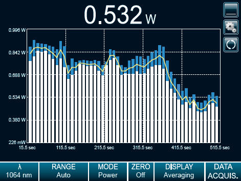 這個(gè)非常特別的模式特別適用于顯示激光器隨時(shí)間的變化趨勢(shì)。設(shè)置每批的點(diǎn)數(shù),然后讓 MAESTRO 確定每批的最小值和最大值。每批的平均值之后會(huì)出現(xiàn)一條黃色曲線,其在屏幕上顯示為條形。條形白色和藍(lán)色部分(分別對(duì)應(yīng)最小值和最大值)相差越大,激光器的穩(wěn)定性越差。