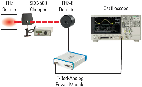 如果您需要測量信號可能淹沒在寬帶噪聲中的較低功率級別(即小于 5 μW),我們推薦使用此模擬設置選項。由 T-RAD-ANALOG 供電的模擬 THZ-B-DA 探測器電壓輸出連接至鎖定放大器輸入,SDC-500 斬波器的同步輸出則連接至參考輸入。鎖定放大器將鎖定斬波頻率,可通過撥入較長積分時間測量均方根很低的電壓。該電壓除以電壓響應度 (V/W) 即等于輻射源的功率。