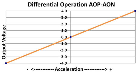 The Model 1522 produces a differential ±4 volts output voltage, the value of which varies with acceleration as shown in the figure. The seismic center is located on a centerline through the dual sense elements halfway between them. Any errors due to rotation about this point are effectively cancelled by the internal electronics.