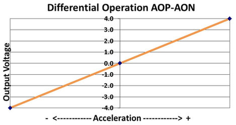The Model 1525 produces a differential +/-4 volts output voltage, the value of which varies with acceleration as shown in figure 1. The seismic center is located on a centerline through the dual sense elements halfway between them. Any errors due to rotation about this point are effectively cancelled by the internal electronics.