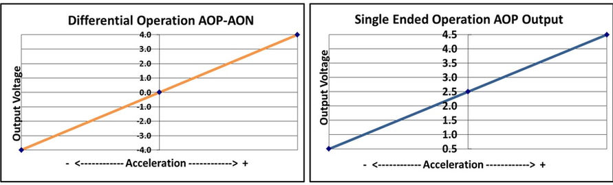 These accelerometers produce differential analog output voltage pairs (AON & AOP) which vary with acceleration. The signal outputs are fully differential about a common mode voltage of approximately 2.5 volts. At zero acceleration, the output differential voltage is nominally 0 volts DC; at ±full scale acceleration, the output is ±4 volts DC, respectively, as shown in the figure (below). The output scale factor is independent from the supply voltage of +8 to +32 volts.