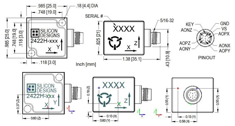 The SDI Model 2422H contains three orthogonally mounted, proprietary SDI Model 1522 accelerometer LCC chips, making them even less sensitive to temperature changes and gradients from -55 to +125°C and greatly reducing bias and scale factor temperature shifts for premium performance. Their enhanced, temperature compensated, premium accelerometer LCCs are individually tested, calibrated and verified in a climate chamber. The 2422H comes with an initial calibration report featuring additional information about the linearity, output, phase, and frequency response as tested for each unit.