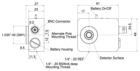 The FPS-1 is a fast optical detector for visualizing and measuring the temporal characteristics of laser beams in the spectral range from 193 nm to 1100 nm. It has a UV enhanced silicon PIN photodiode and is designed to convert optical signals into electrical signals which are then measured with third party measurement instrumentation such as oscilloscopes or spectrum analyzers for measurement. The FPS-1 has a rise time of 1.5 nsec. Its reverse bias voltage is provided either by internal batteries or by an external DC power supply (included).