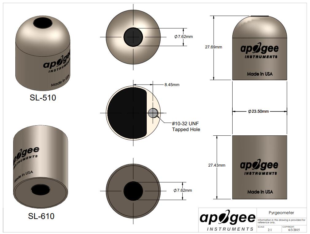 The SL-610 is a downward-looking thermopile pyrgeometer. The sensor incorporates a filter, blackbody thermopile detector, and thermistor with a rugged, self-cleaning sensor housing design, and high-quality cable terminating in pre-tinned pigtail leads for easy connection to dataloggers and controllers. Typical applications include longwave radiation measurement in agricultural, ecological, and hydrological weather networks and renewable energy applications. Sensor includes IP68 marine-grade stainless-steel cable connector 25 cm from head to simplify sensor removal and replacement for maintenance and recalibration.