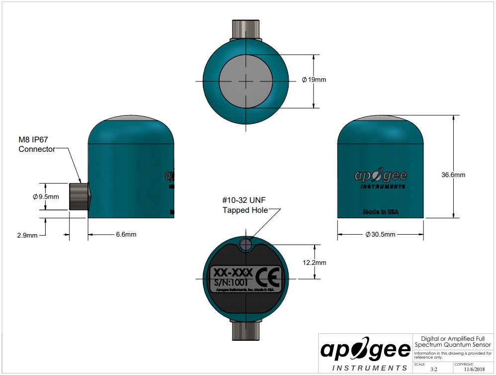 The analog version of this sensor (SQ-100X-SS) comes with the inline cable connector placed 30 cm from the sensor head for either standard use as a long-cable pigtail sensor, or for use with our microCache Bluetooth Micro Logger by unscrewing the connector, discarding the long section of cable and then screwing the sensor to the mating connector on the microCache.