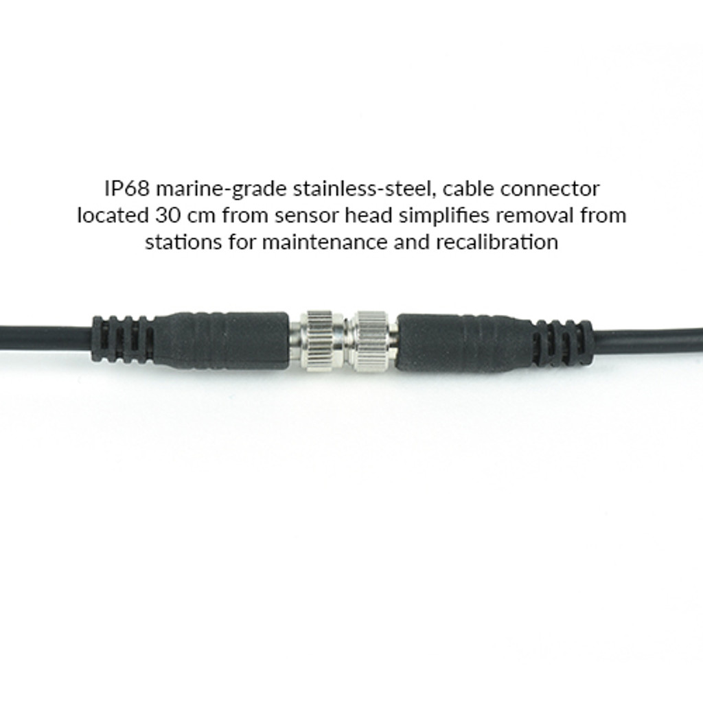 | Cable | 5 m of two conductor, shielded, twisted-pair wire with TPR jacket (high water resistance, high UV stability, flexibility in cold conditions); pigtail lead wires; stainless steel, M8 connector located 25 cm from sensor head |