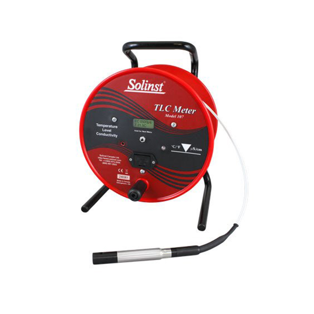 The Model 107 TLC Meter is ideal for profiling conductivity and temperature in wells and open water, for salt-water intrusion studies, and a general indication of contamination levels. The 3/4" (19 mm) diameter probe is attached to Solinst PVDF flat tape; accurately laser marked every 1/100 ft or each millimeter. Lengths up to 1000 ft or 300 m, mounted on a Solinst reel.